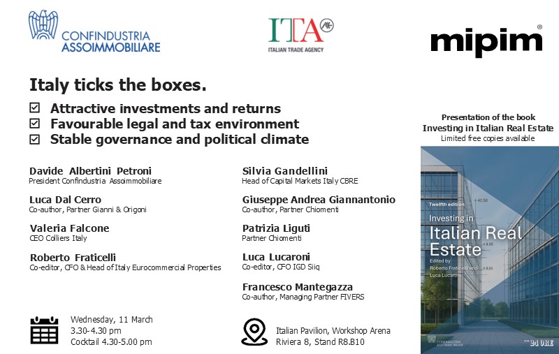 Confindustria Assoimmobiliare ha presentato la 12ª edizione del volume Investire nel Real Estate italiano, riferimento consolidato per investitori e operatori del settore, nell’ambito del MIPIM 2026