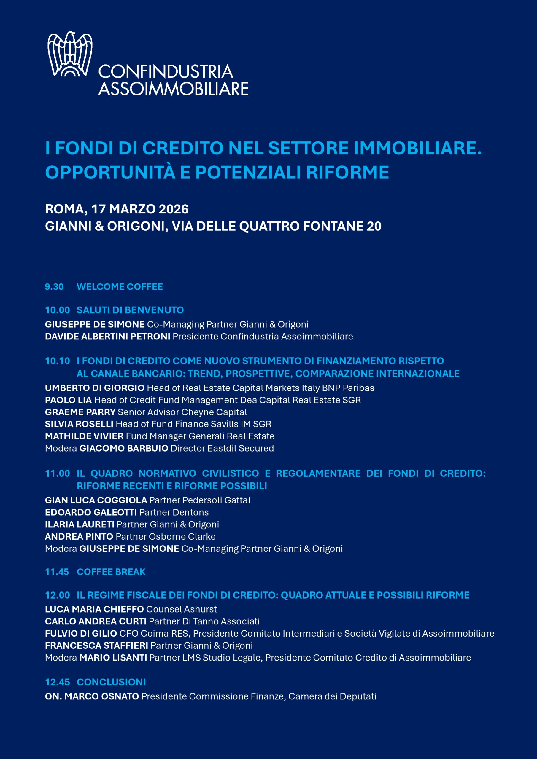Si è svolto a Roma, presso lo Studio Gianni & Origoni, il convegno promosso dal Comitato Credito di Confindustria Assoimmobiliare, presieduto da Mario Lisanti (LMS Studio Legale), dal titolo “I fondi di credito nel settore immobiliare. Opportunità e potenziali riforme”.